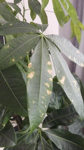 Wygląda to na robotę przędziorków... nie widać na niej takich delikatnych pajęczynek? Ale co by to nie było, to warto spryskać preparatem na bazie czosnku (np. Bioczos) - są naturalne i zwalczają i różne szkodniki, i choroby grzybowe. A tu jest dobry artykuł o warunkach, jakie trzeba zapewnić pachirze - http://www.e-ogrodek.pl/a/uprawiamy-pac ... 20351.html